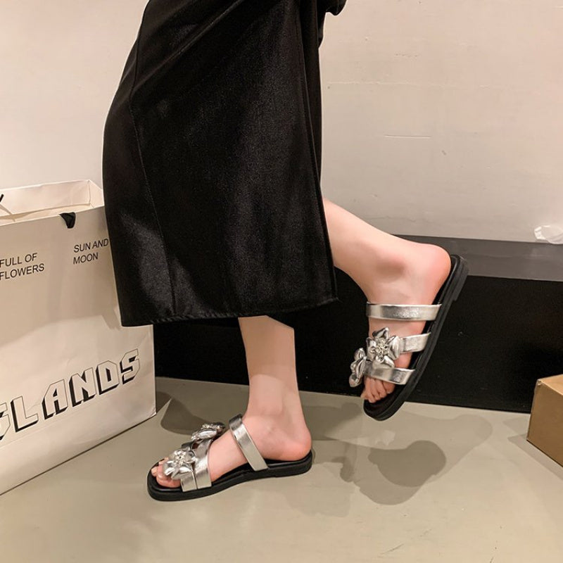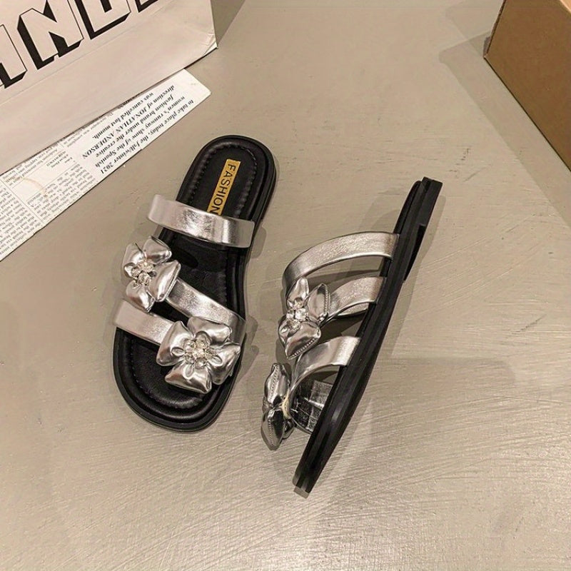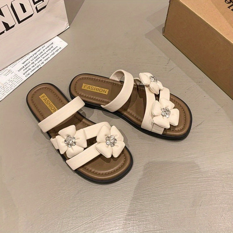 2025 New Korean Style Summer Open-Toe Flat Sandals for Women - Casual Fashion, Floral Embellishments, Non-Slip Rubber Sole, Ankle Strap, Beige & Black Design, Summer Sandal