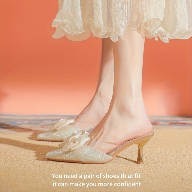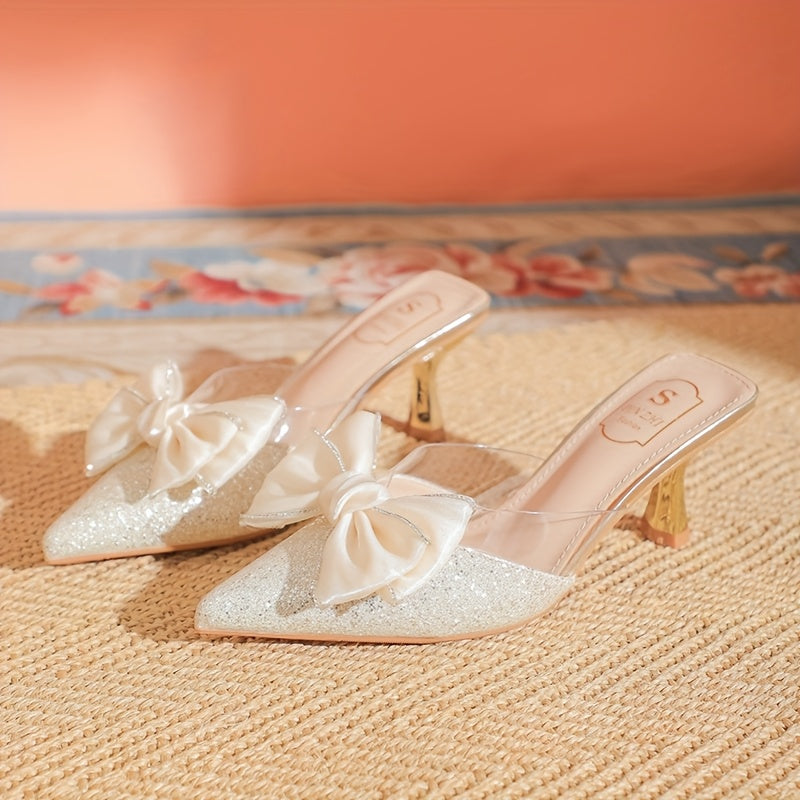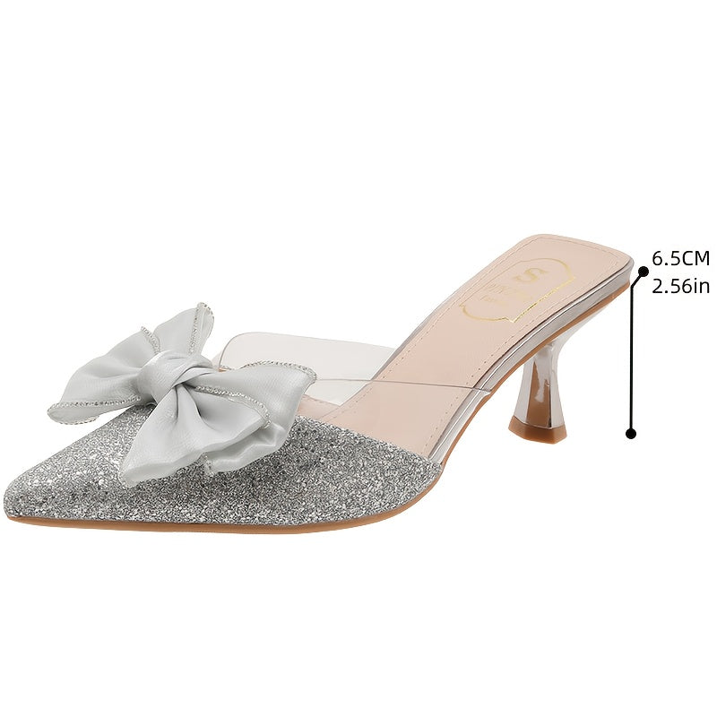 Elegant French-Inspired Pointed-Toe Mules with Bow Detail & Rhinestones - High Heel, Pointed Toe, Fabric Upper, Rubber Sole, Pointed Toe Mules