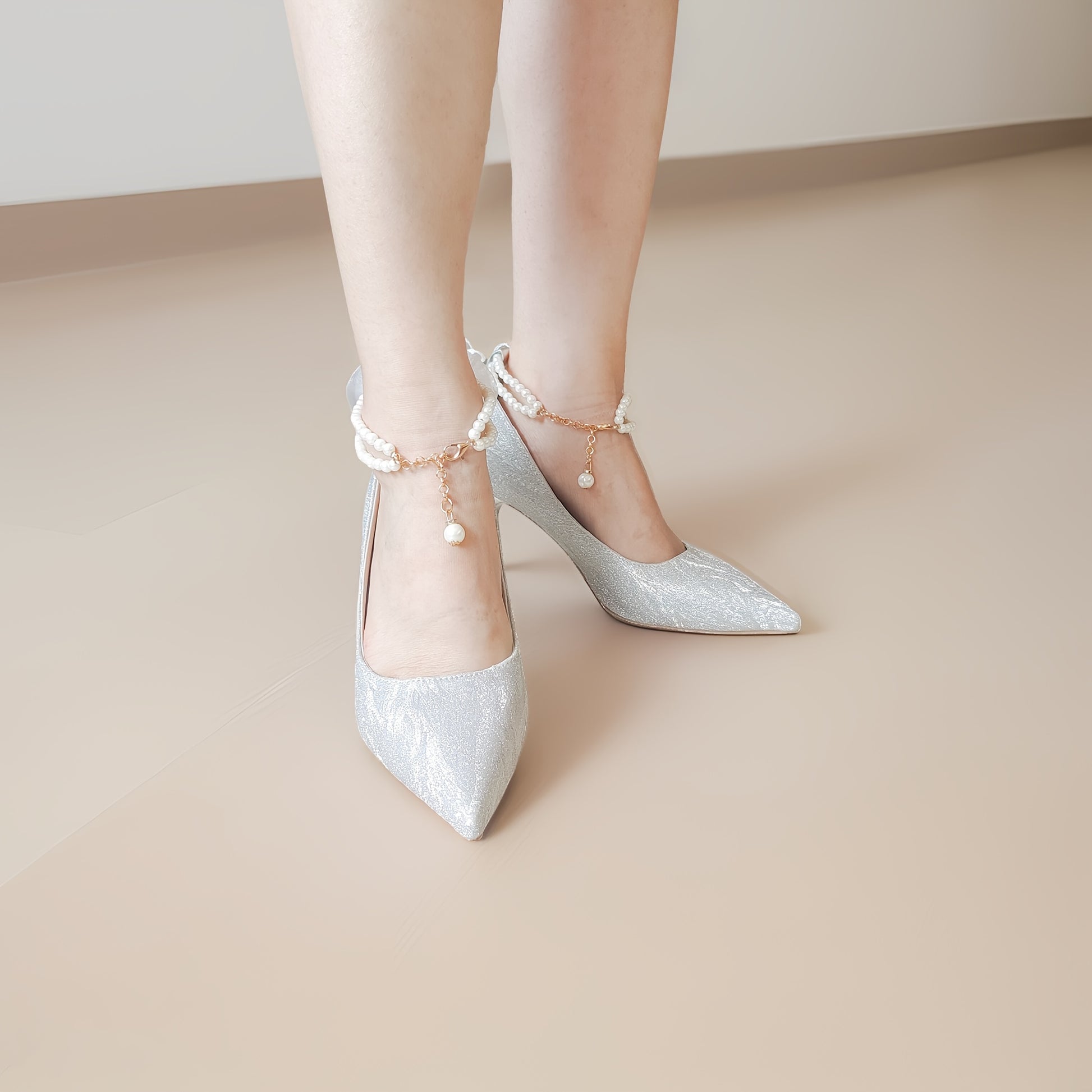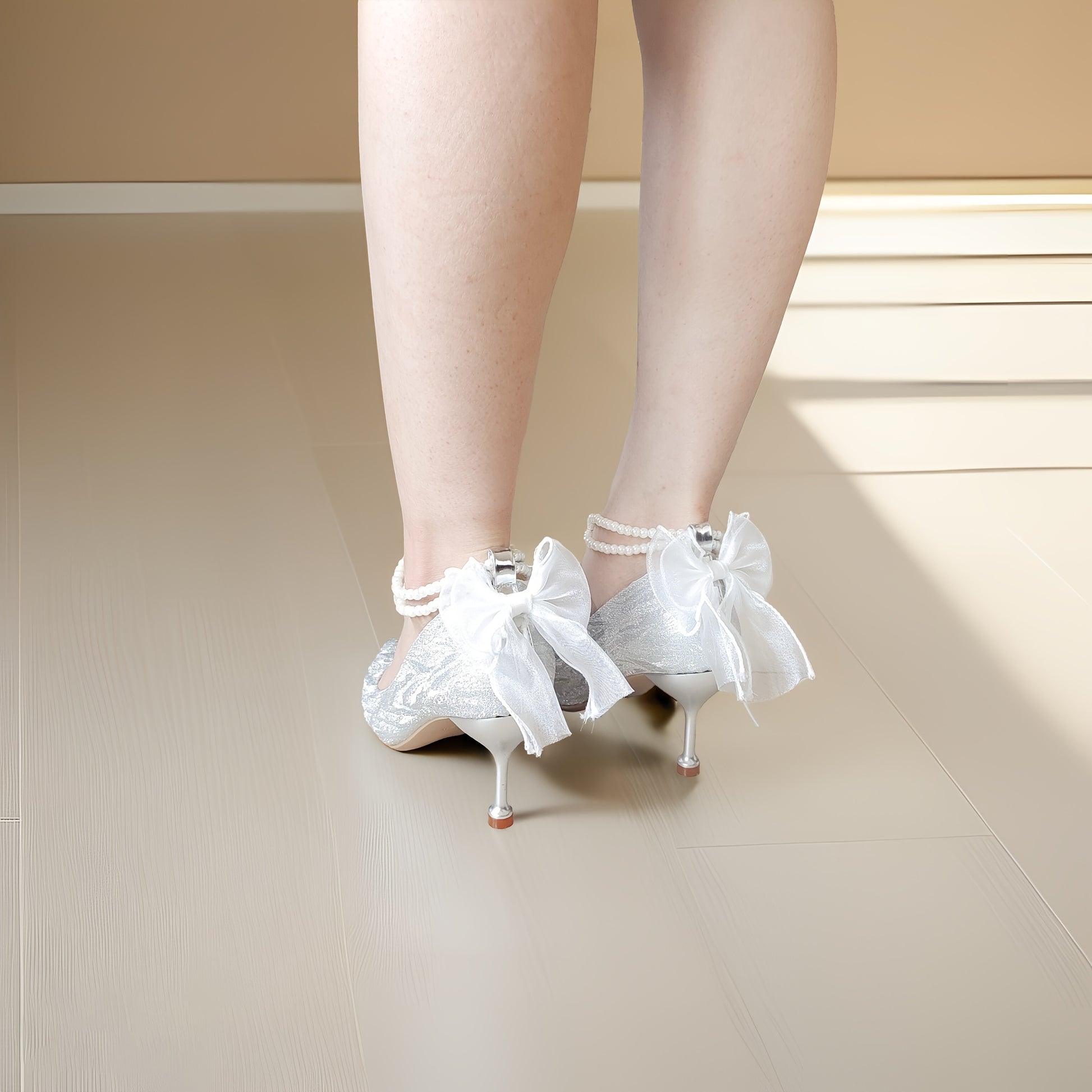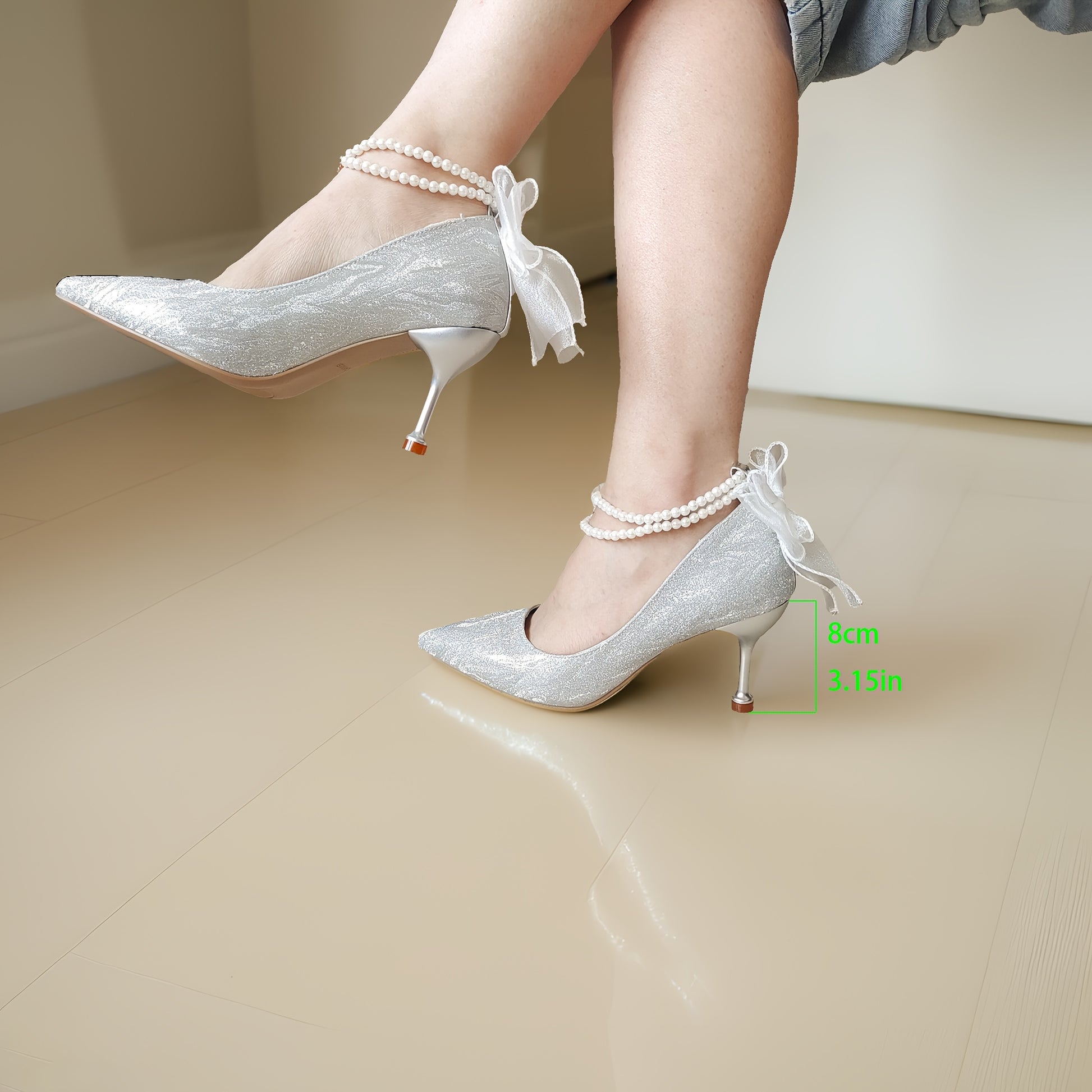 Elegant Silvery Stiletto Heels for Women with Bow Detail - Pointed Toe, Synthetic Cover, Rubber Sole, All-Season Versatile High Heels|Glittery Heels|Rubber Sole Heels