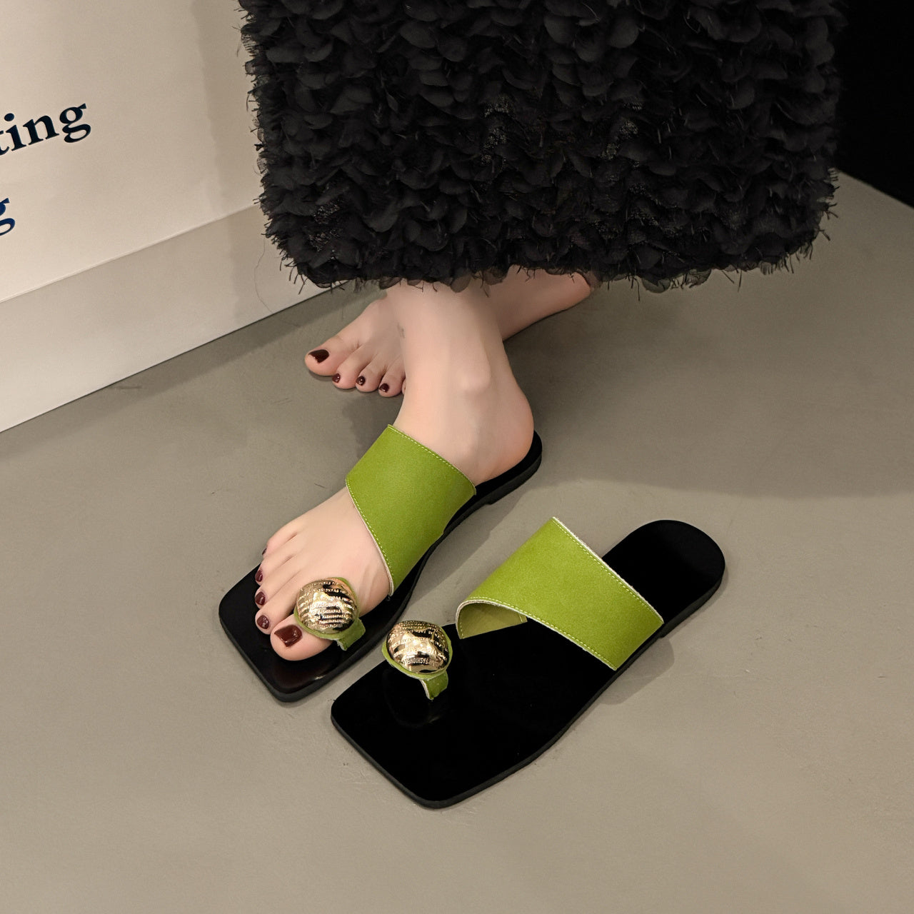 Elegant Women'S Flat Sandals - Black Open Toe Slip-On with Green Toe Straps, TPR Sole, Synthetic Cover Summer Casual Shoes for Casual Attire, Strappy Sandals