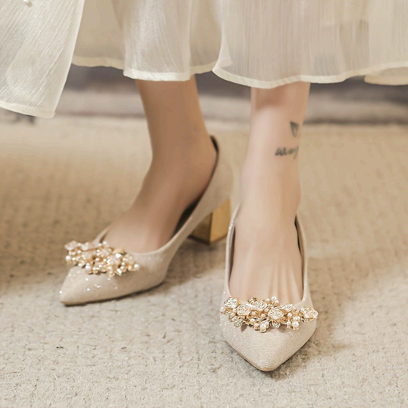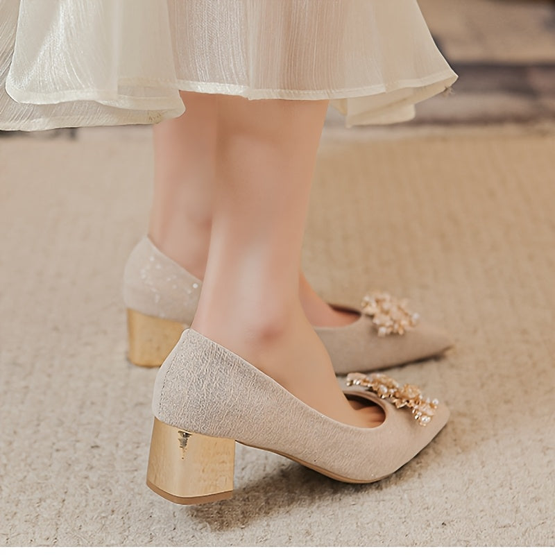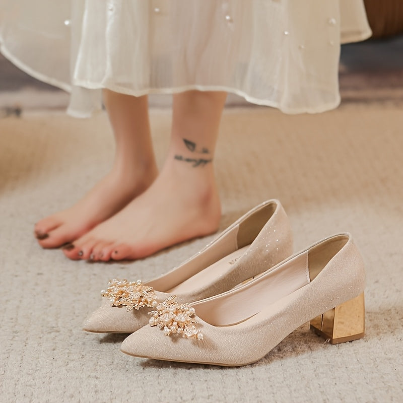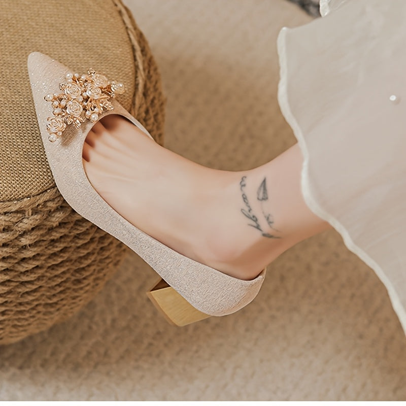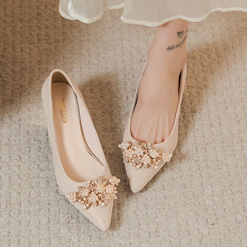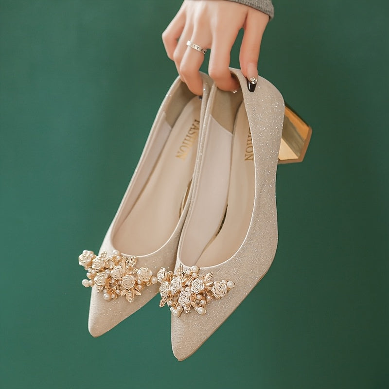 Women'S Elegant Golden-Tone High Heel Pumps with Floral Rhinestone Embellishments - Perfect for Formal Events, Weddings, and Formal Occasions, Formal Footwear | Floral Embellishments | Rubber Sol