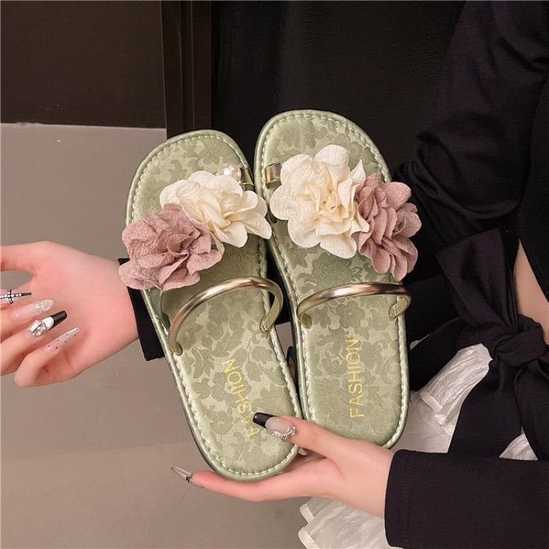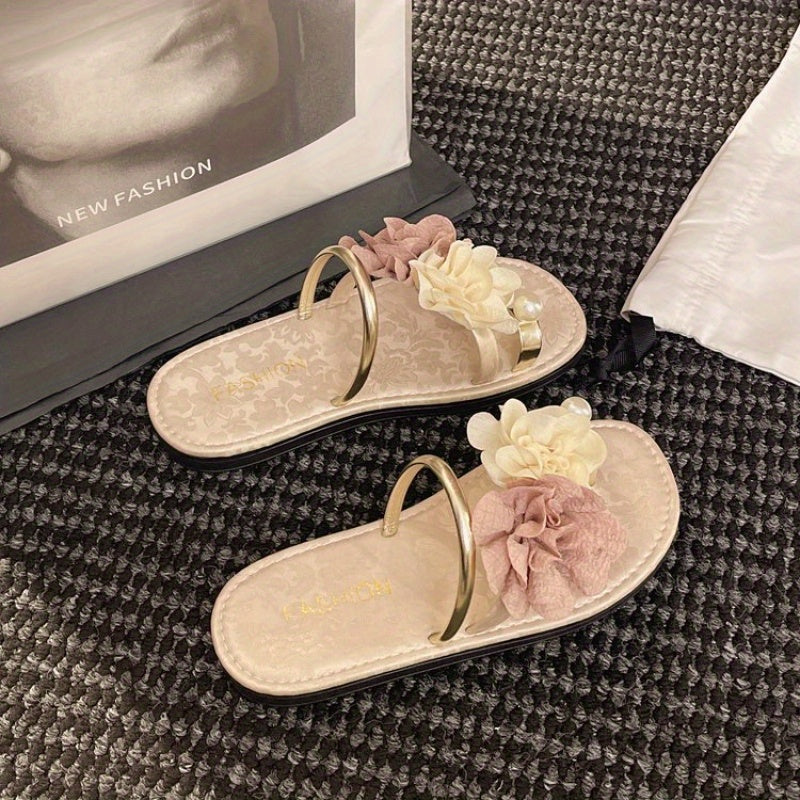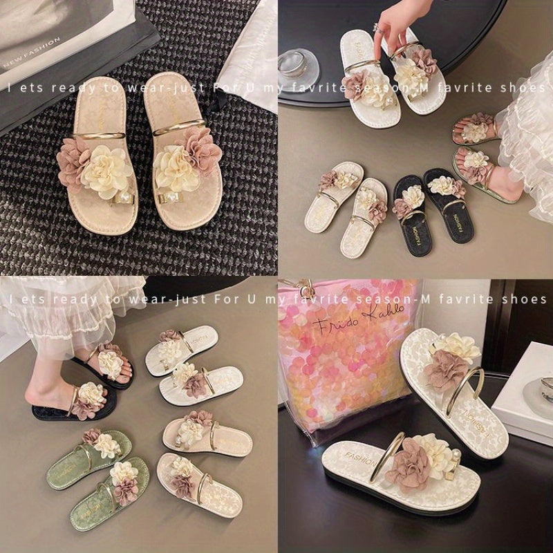 Women's Floral Embellished Slip-On Slippers with Golden Accents - Soft Fabric Upper, Non-Slip Rubber Sole & Cushioned Insole for All-Season Indoor\u002FOutdoor Comfort, Cute Slippers, Indoor Footwear, Elegant Slipon, Durable Comfort