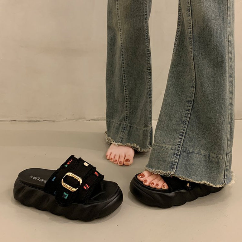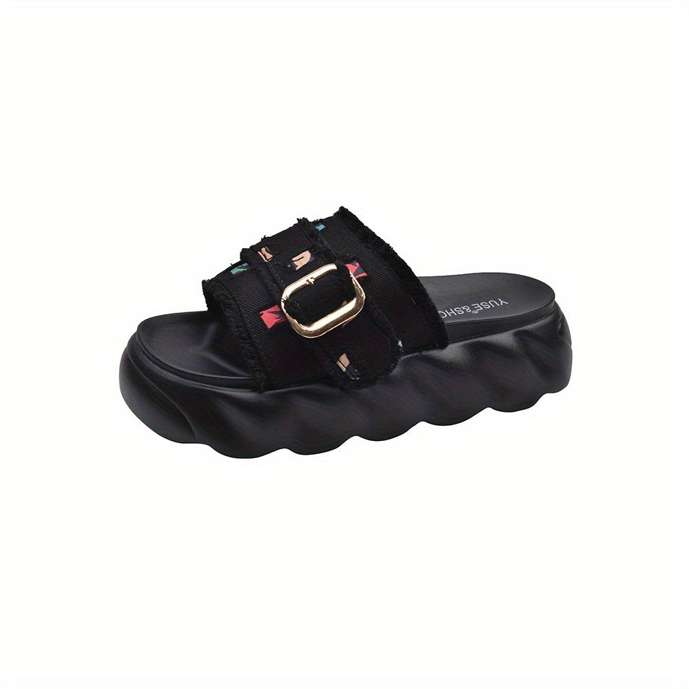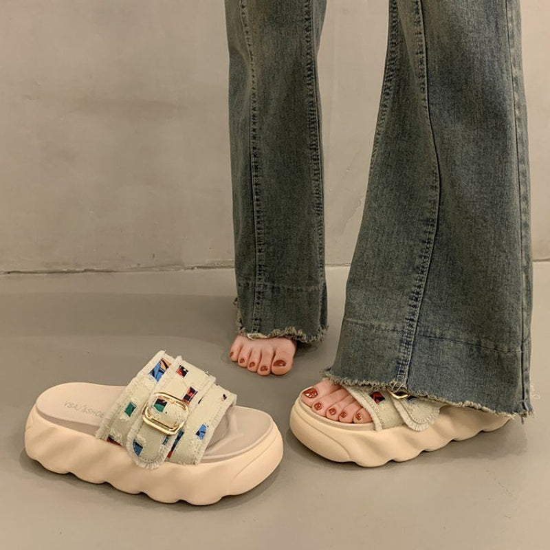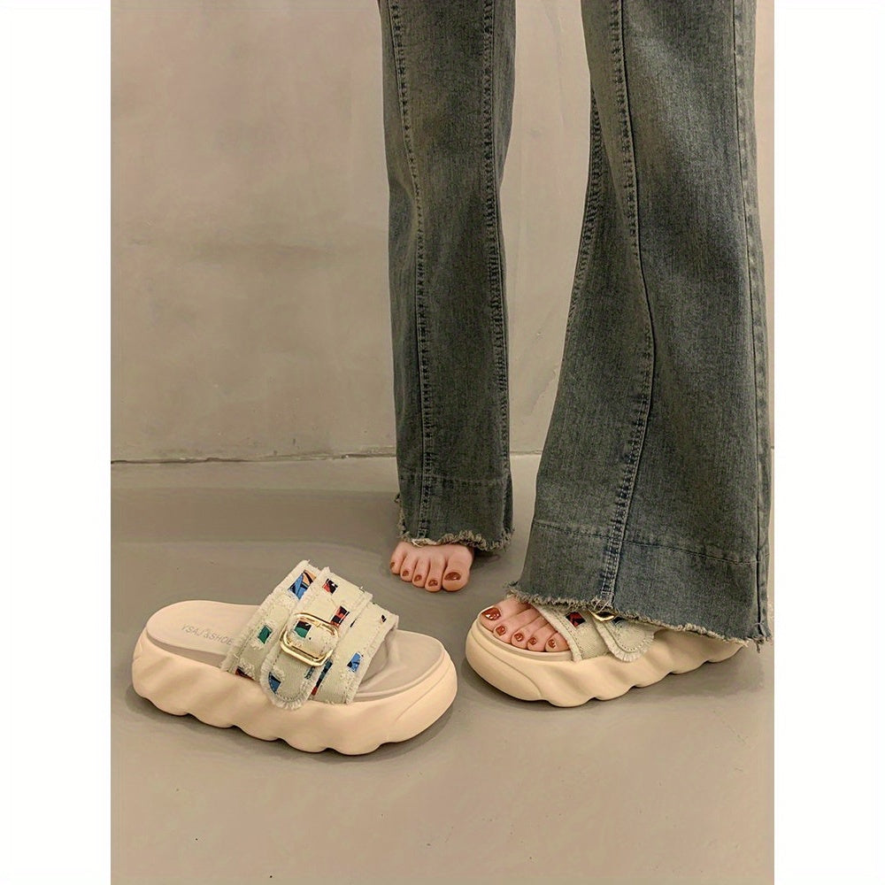 Women'S French-Inspired Chunky Sole Slide Sandals - White Fabric Upper with Colorful Embroidery