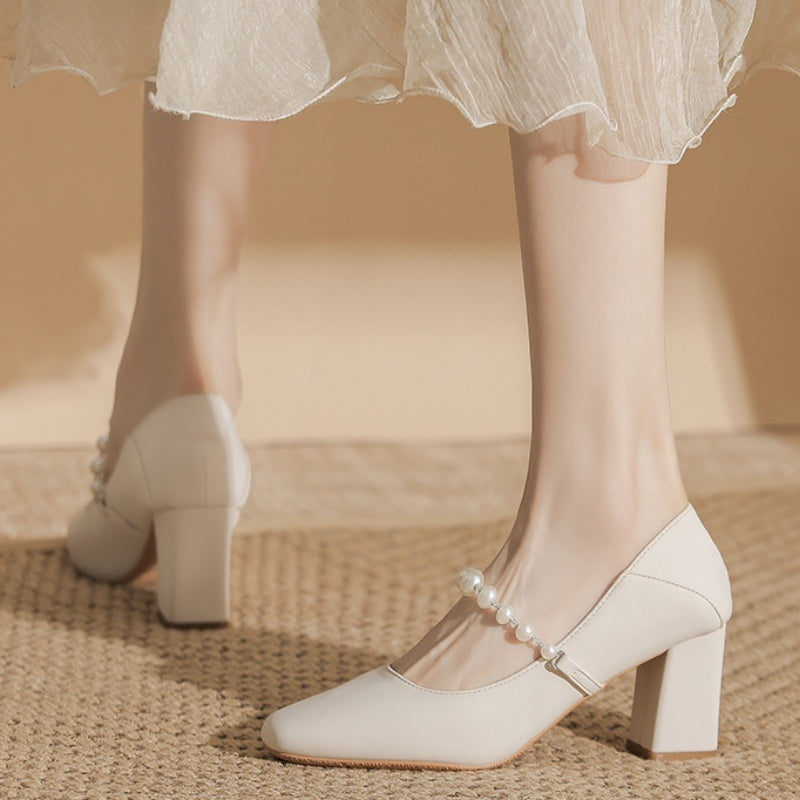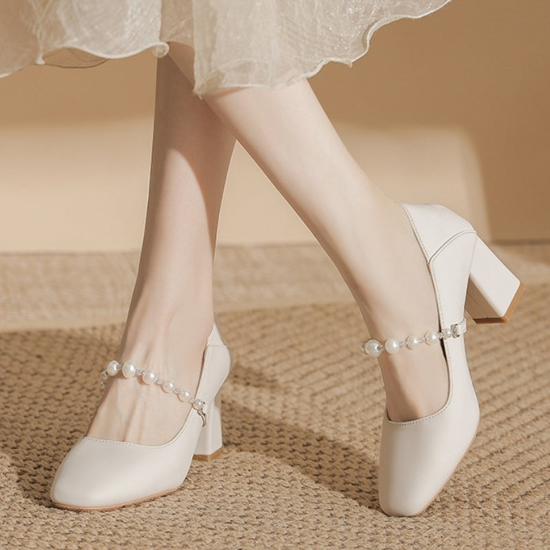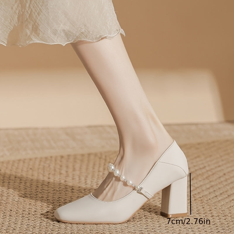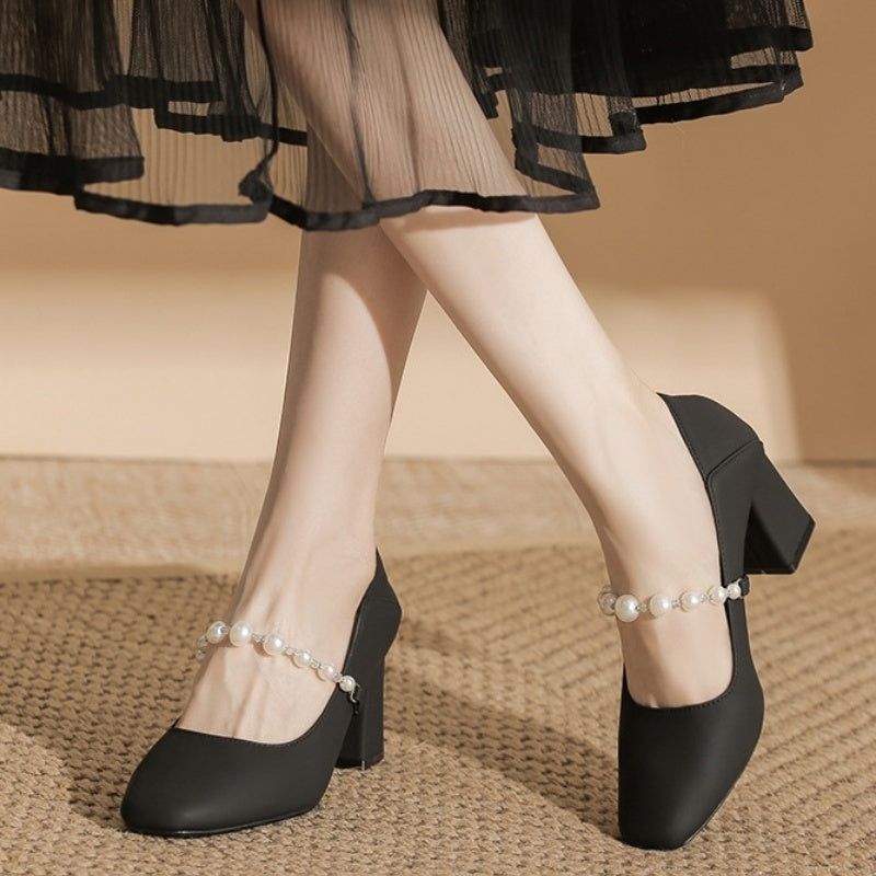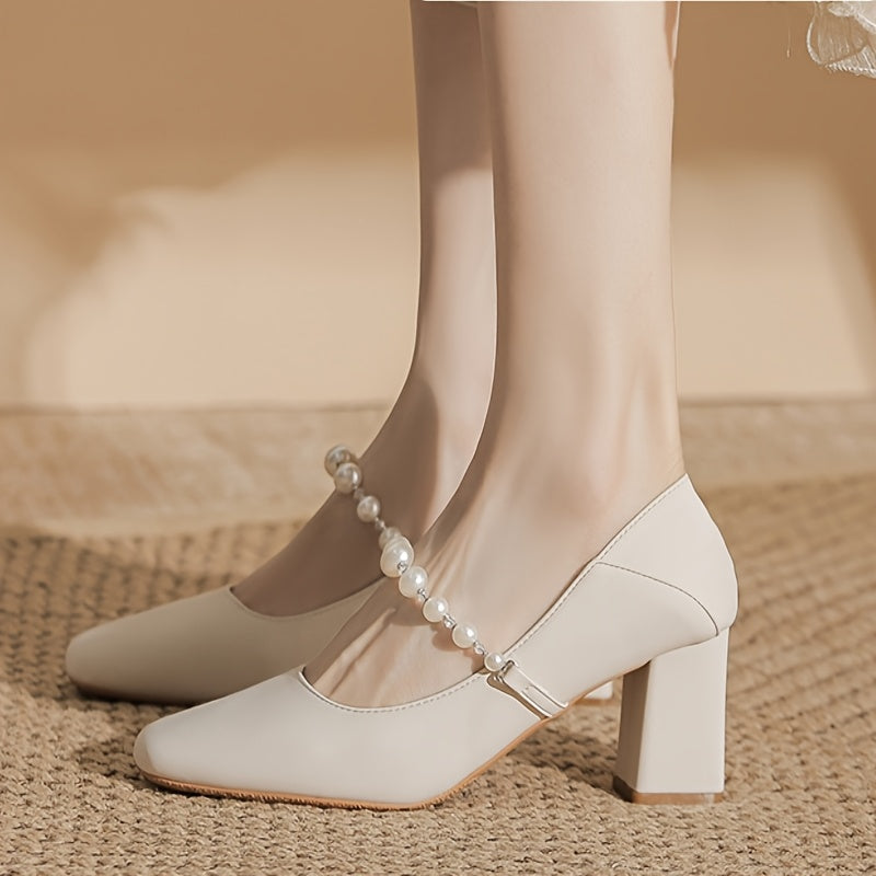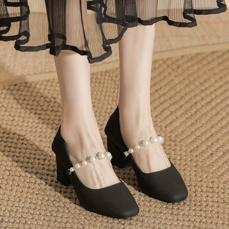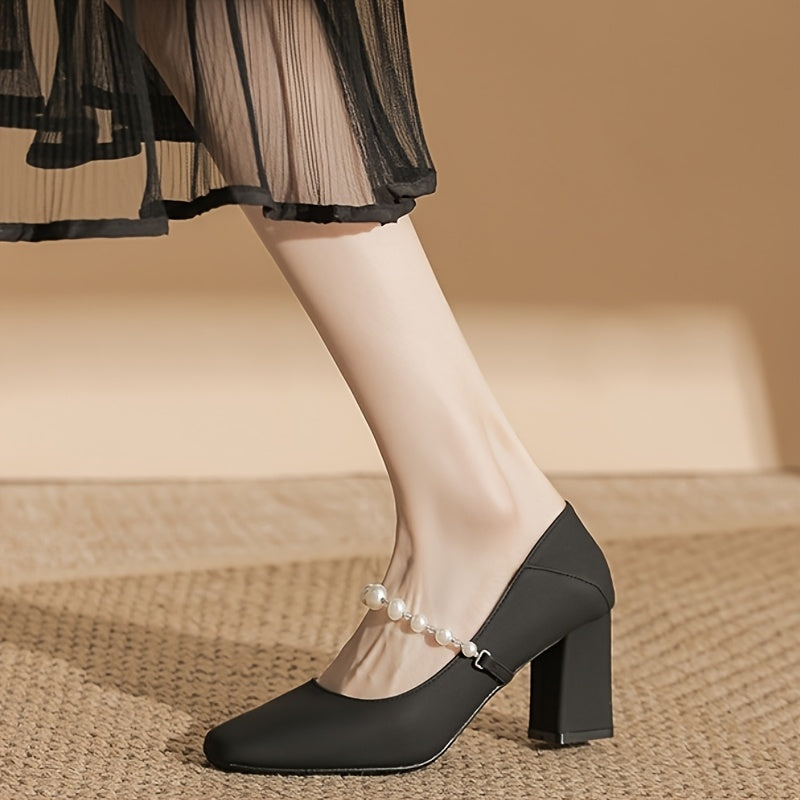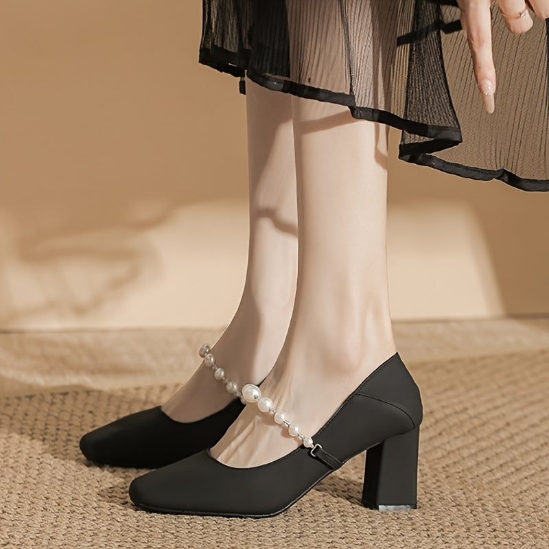 Women'S Square Toe Block Heel Pumps with Faux Pearl Ankle Strap - Elegant Black Synthetic Cover Dress Shoes, Comfortable Rubber Sole for Office & Formal Events, Versatile High Heel Design, Office Footwear, Polka Dot Pattern, Durable Footwear