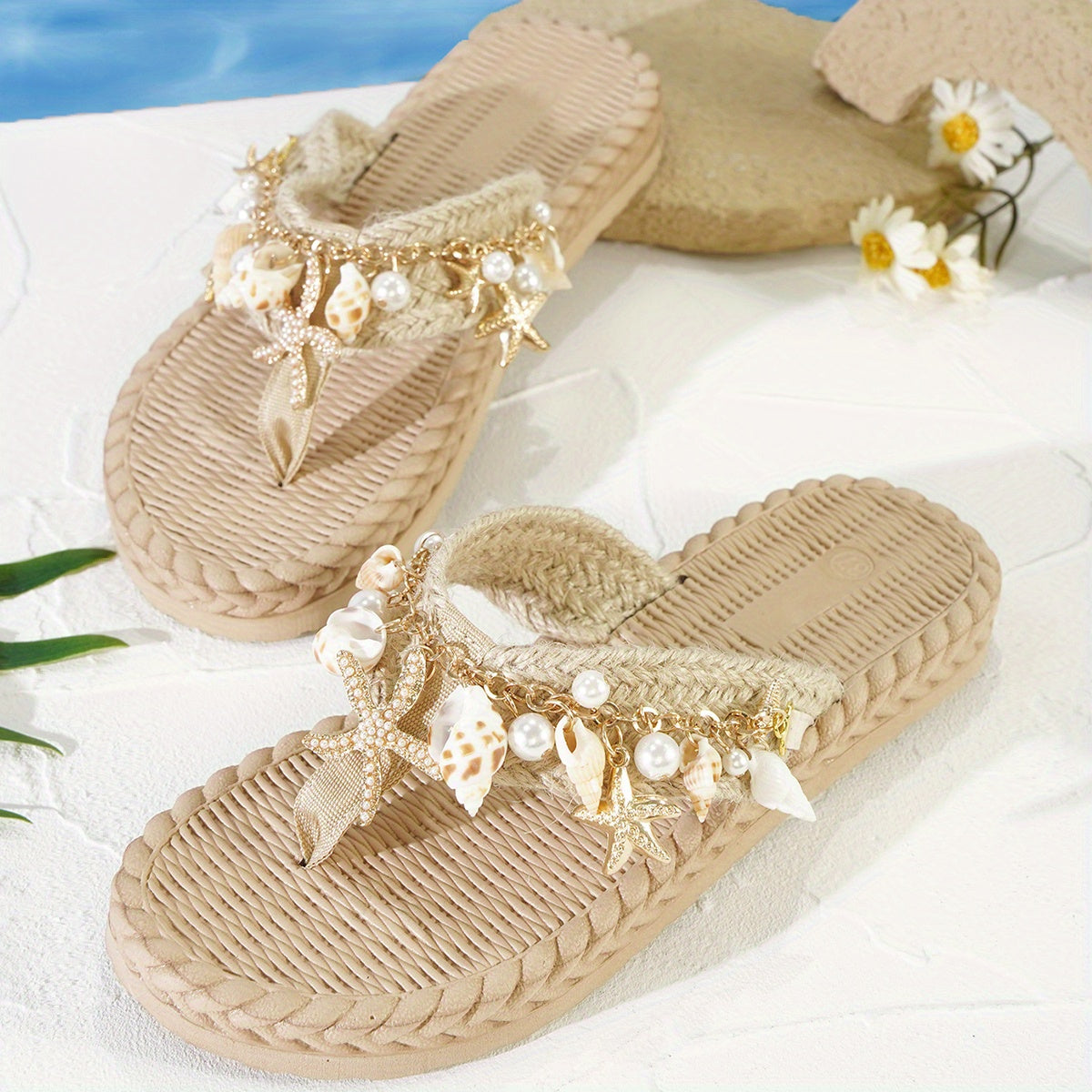 Women'S Summer Beach Flip-Flops with Shell Chain Accents - Casual Woven Straw Flat Sandals, Round Toe & Slip-On Design for Poolside, Vacation, or Casual Attire, Beach Shoes