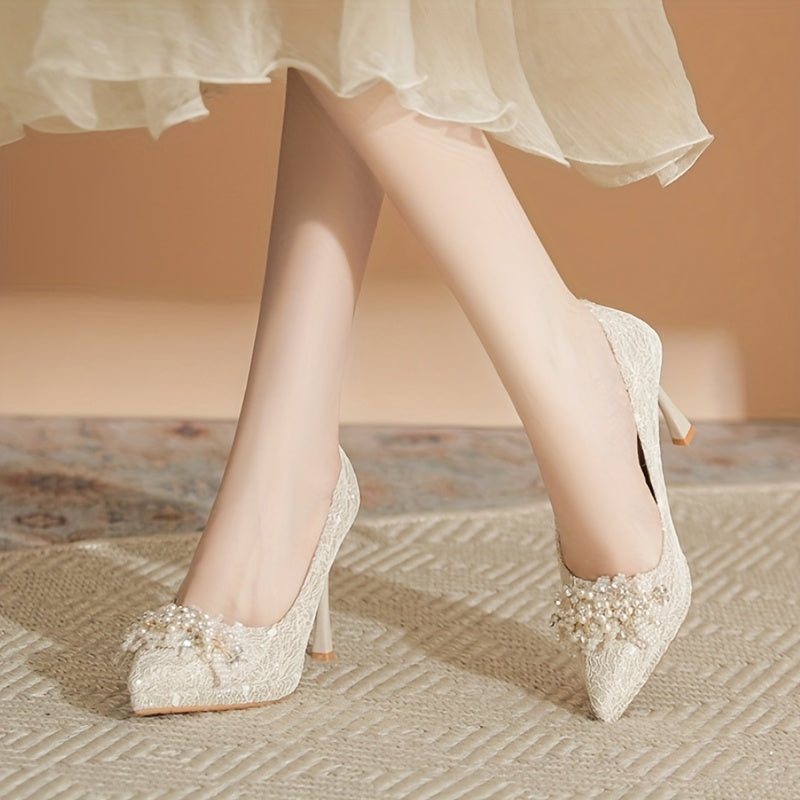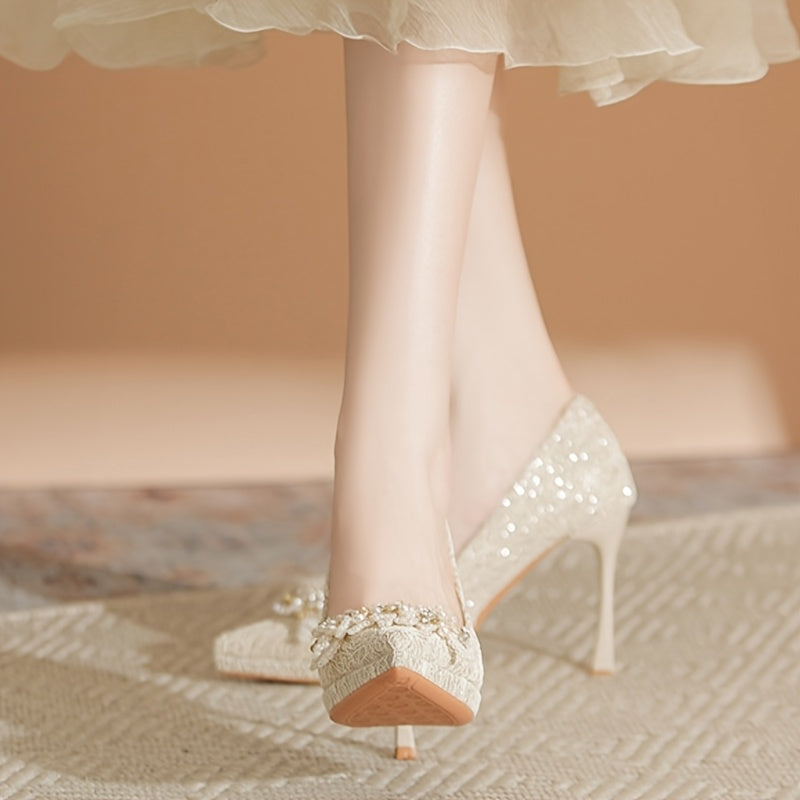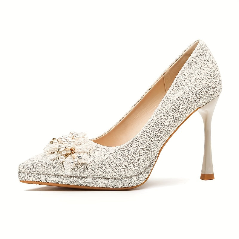 Women's wedding shoes with beaded flowers, designed for brides to pair with their main wedding dresses. These shoes feature shallow openings, thin heels, and offer comfort, making them high-heeled shoes perfect for the big day.